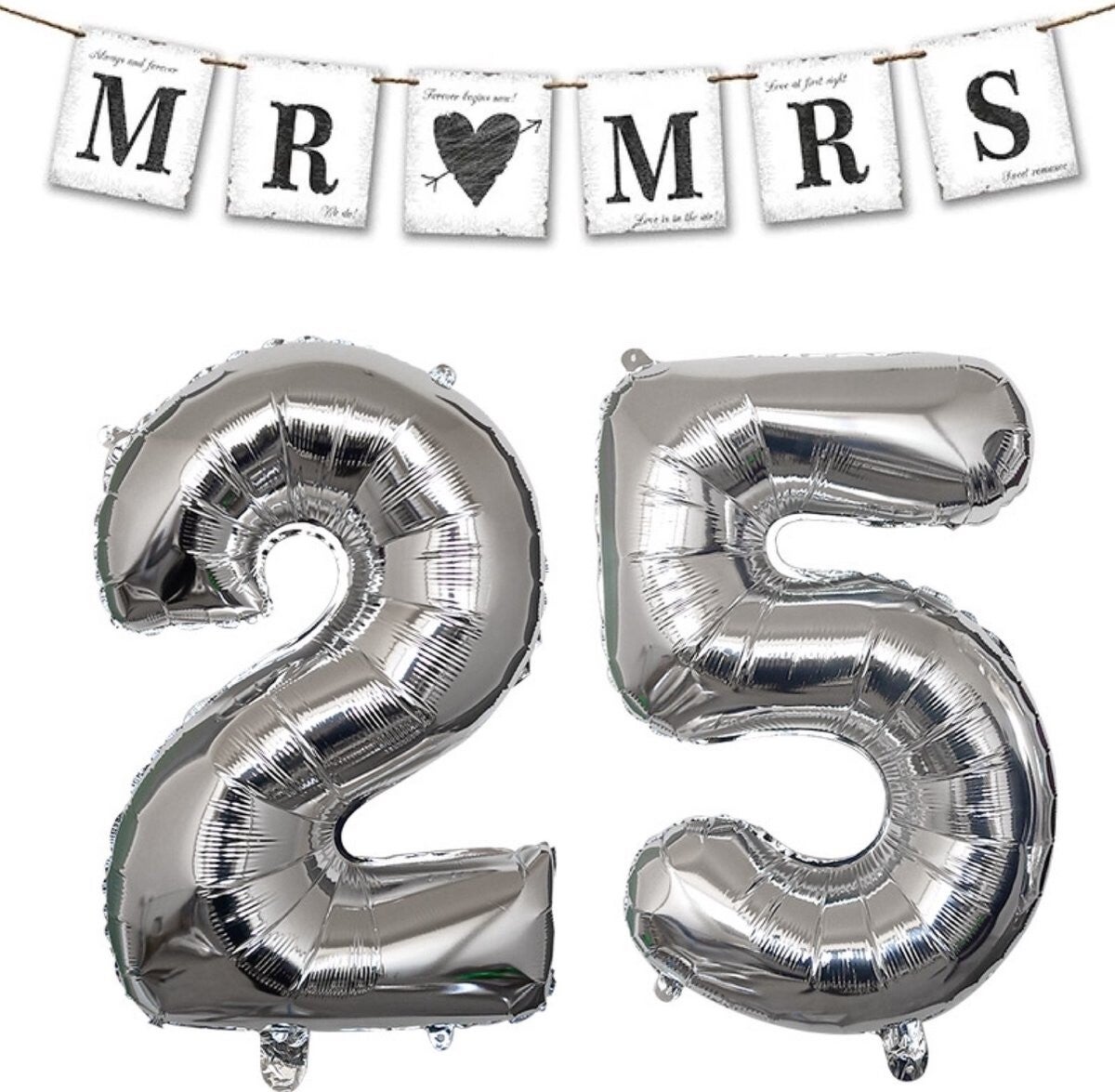 Mr and Mrs Always and Forever set 25 jaar zilver met slinger en folie ballonnen
