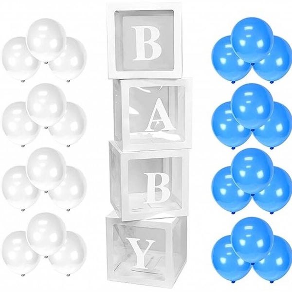 Vier doorzichtig letter ballon blokken Baby wit met 24 blauwe en witte ballonnen