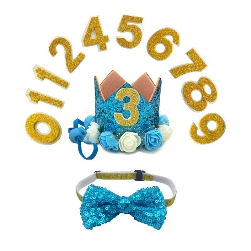 - zelfklevende gouden glitter letters van 0-8. Deze letters zijn makkelijk op het hoedje te plakken en weer te verwijderen. Daardoor is deze set voor meerdere verjaardagen te gebruiken. Je kan zo een leuke serie maken van de opeenvolgende verjaardagen van je huisdier.