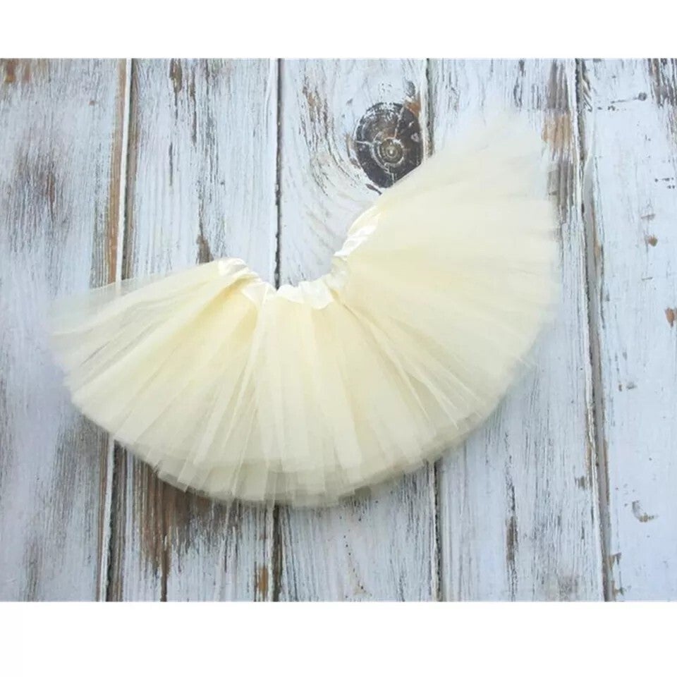 Het setje bestaat uit een witte romper met goud glitter opdruk One en een ivoorkleurige tutu. De bijpassende goudkleurige haarband is versierd met 3 romantische ivoorkleurige bloemen