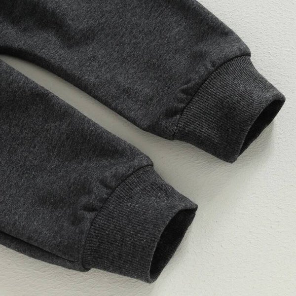 Kleuren sweater: wit met licht grijze en zwarte opdruk One. Broek: donker grijs met wit koord
