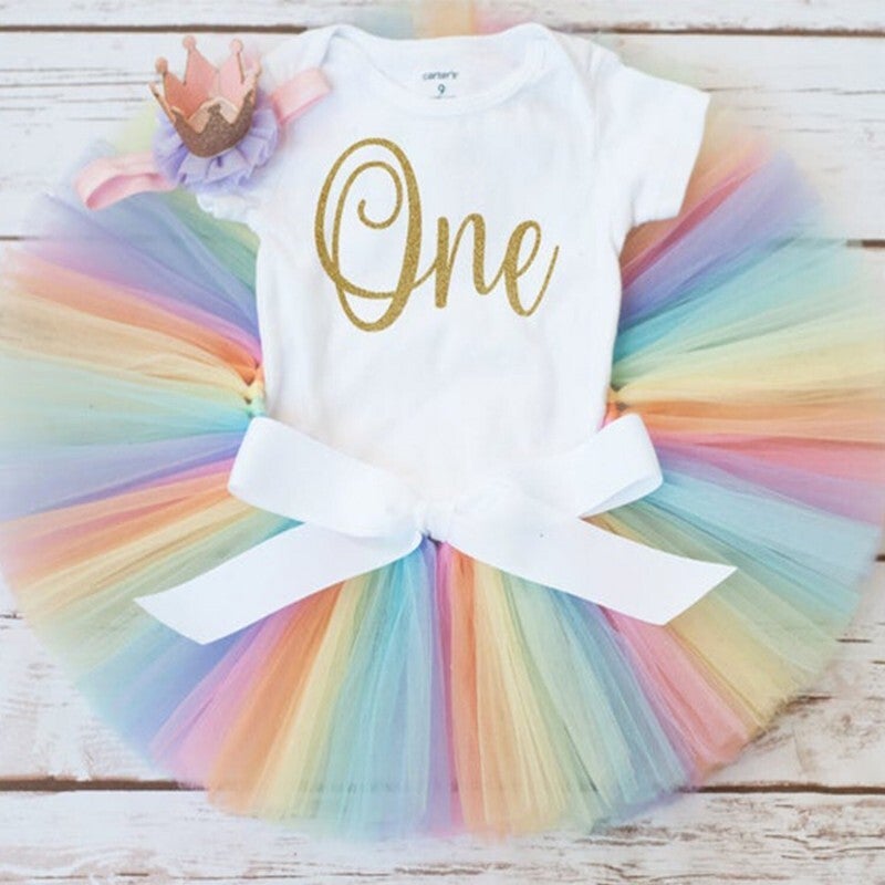 Prachtige set voor een meisje, bestaande uit een witte romper met korte mouw en in goud One er op gedrukt, een weelderige zachte regenboog kleurige tutu en een haarband met schattig klein verjaardags hoedje