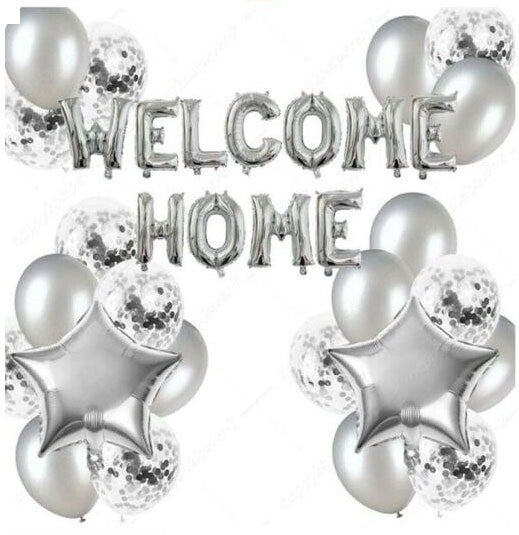 - 11 folie letter ballonnen van elk 40 cm hoog, die samen de tekst Welcome Home vormen