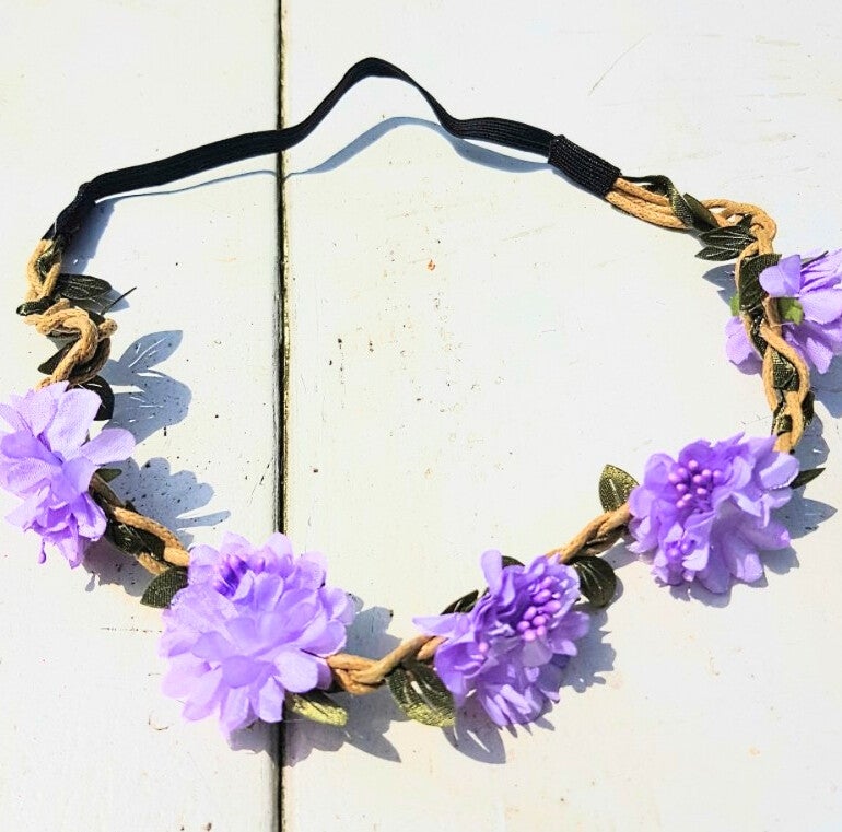 Bohemian style gevlochten haarbandje met blaadjes en paarse bloemetjes