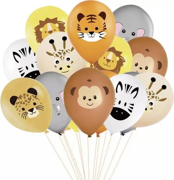 - 18 ballonnen Jungle Animals. Groote opgeblazen: 30 cm. Materiaal: latex. Deze set heeft 6 verschillenden afbeeldingen. Van elke afbeelding zijn er 3 stuks.