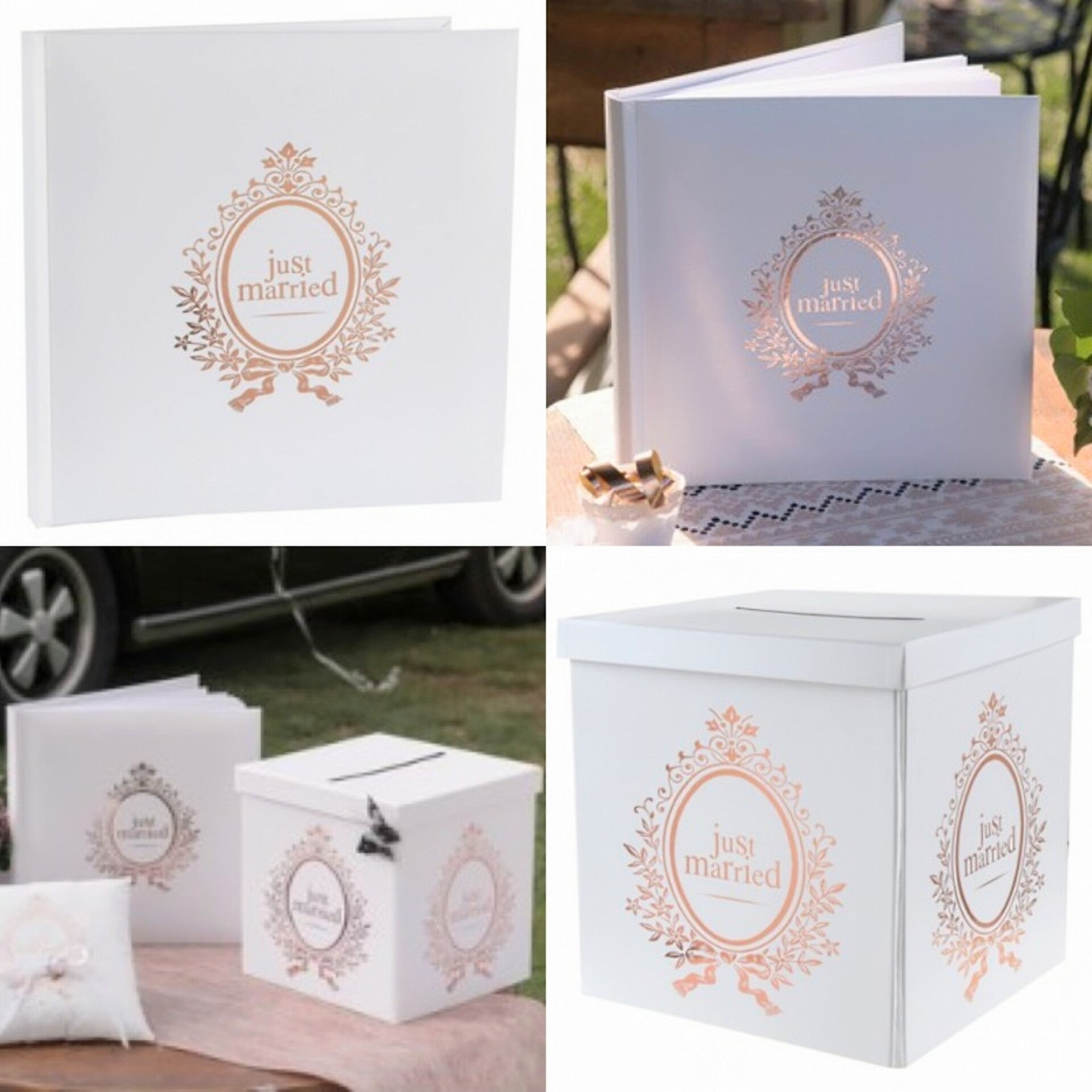 2-delige bruidsset Just Married rosé goud met gastenboek en moneybox