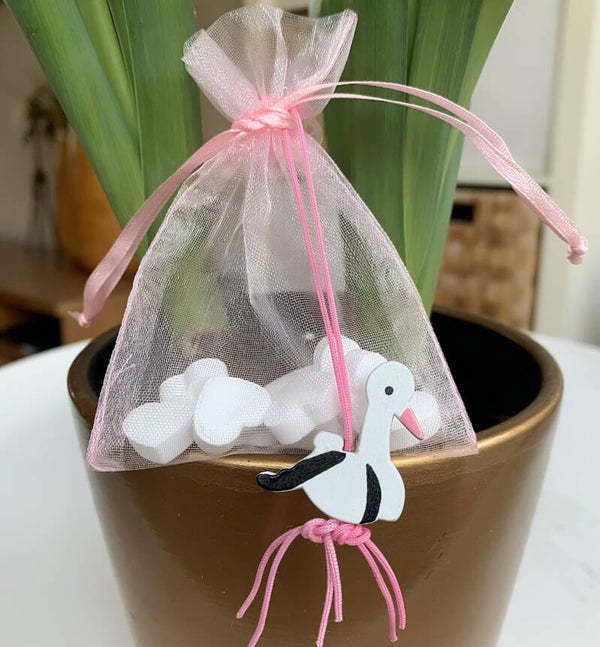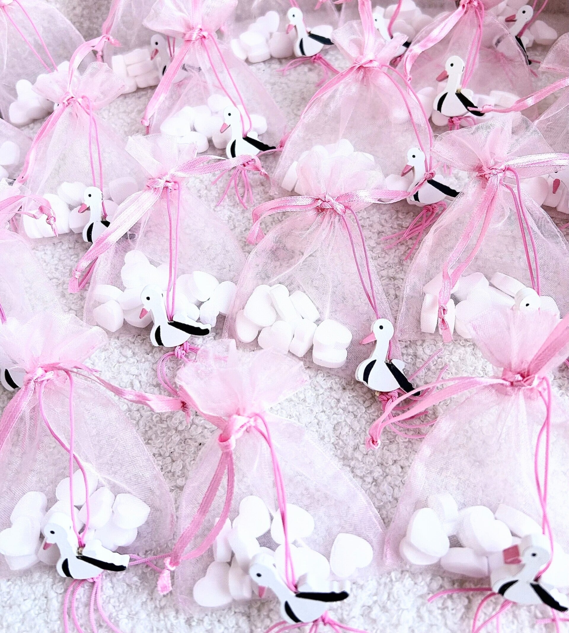 Kant en klaar bedankje in de vorm van een roze organza zakje van 7 x 10 cm met daarin 10 overheerlijke mini pepermuntjes en een gelukspoppetje in de vorm van een ooievaar wit met roze er aan.