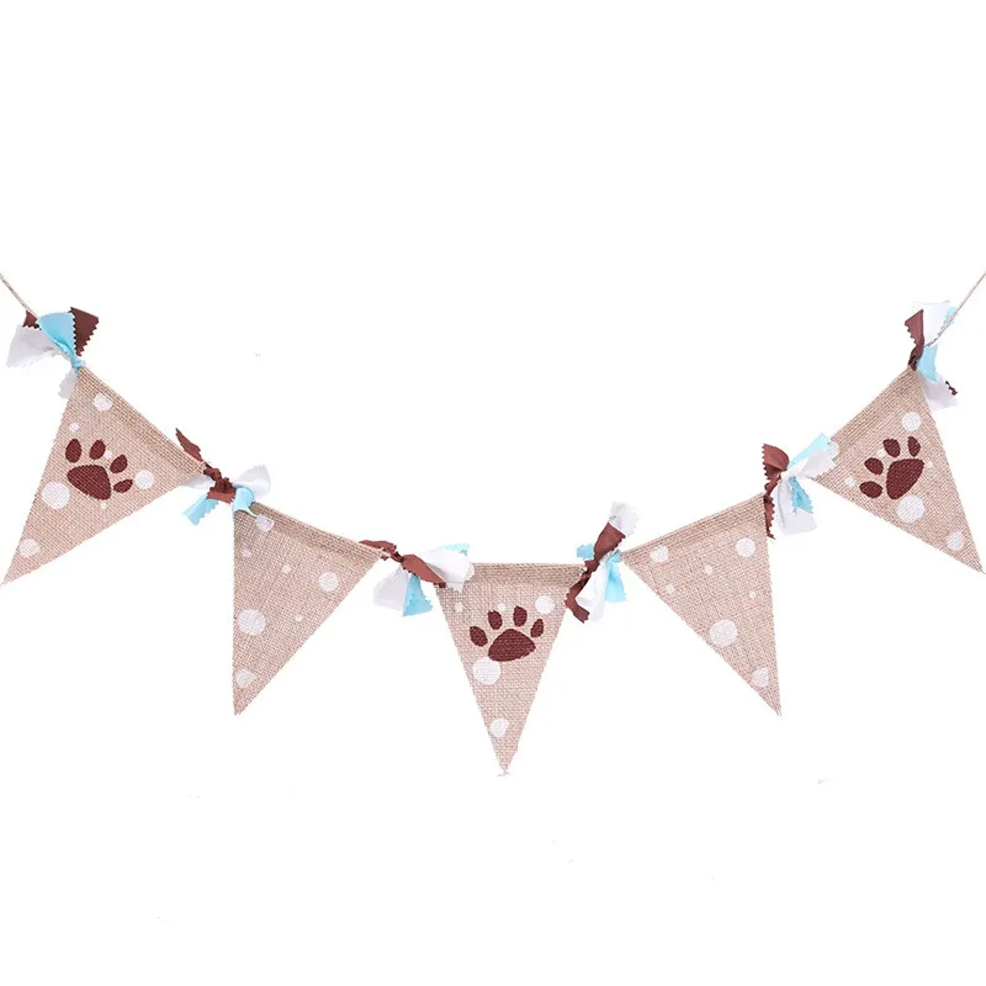 Deze slinger heeft 5 vlaggetjes en diverse blauwe strikjes.Het touw van slinger is 2 meter lang en elke vlag is 17 x 12 cmMateriaal: jute, lint en touw