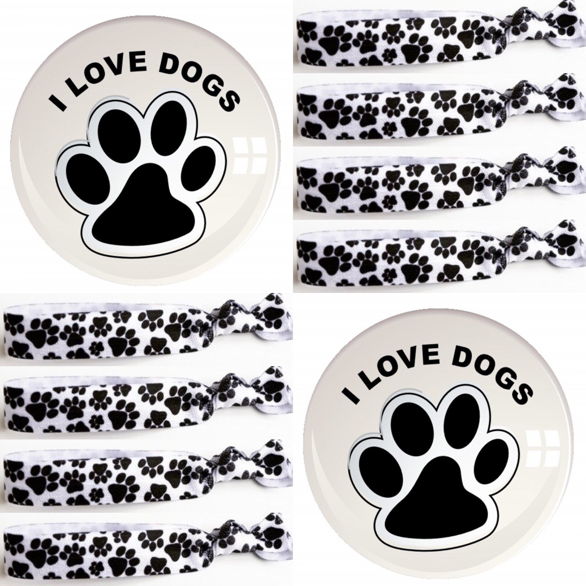 - 8 elastische armbanden/haarelastieken wit met zwarte honden pootjes. Breedte 1 cm