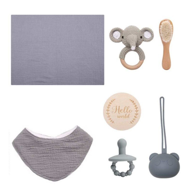 Met knuffeldeken/handdoek, slab, houten bijtring/rammelaar met gehaakte olifant, borstel, speen, speenhouder en houten milestone foto accessoire.