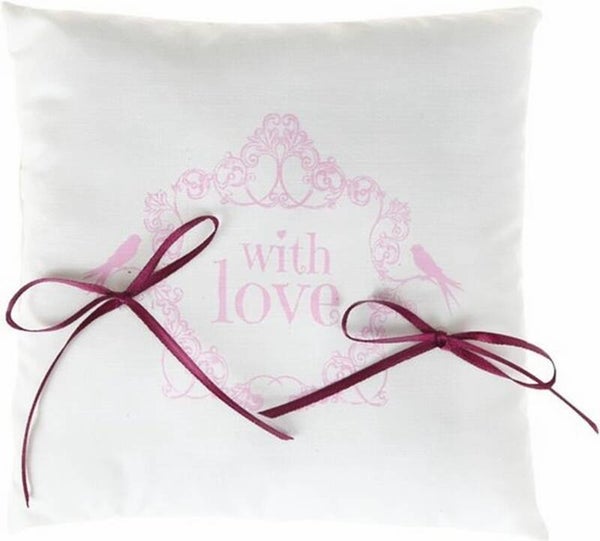 - 1 Ringkussen Vintage Pink met 2 lintjes, zodat elke ring afzonderlijk vastgemaakt kan worden. Afmeting: 18 x 18 cm.
