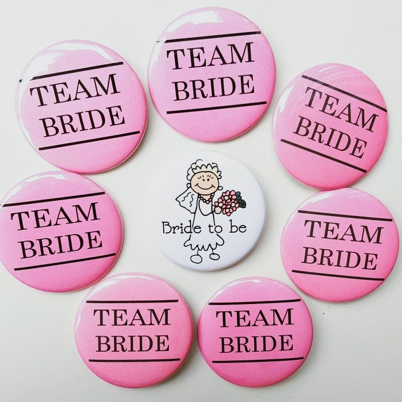 Deze 8-delige set bestaat uit 7 X button Team Bride roze en 1 x button Bride to Be wit en is super leuk voor het vrijgezellenfeest.