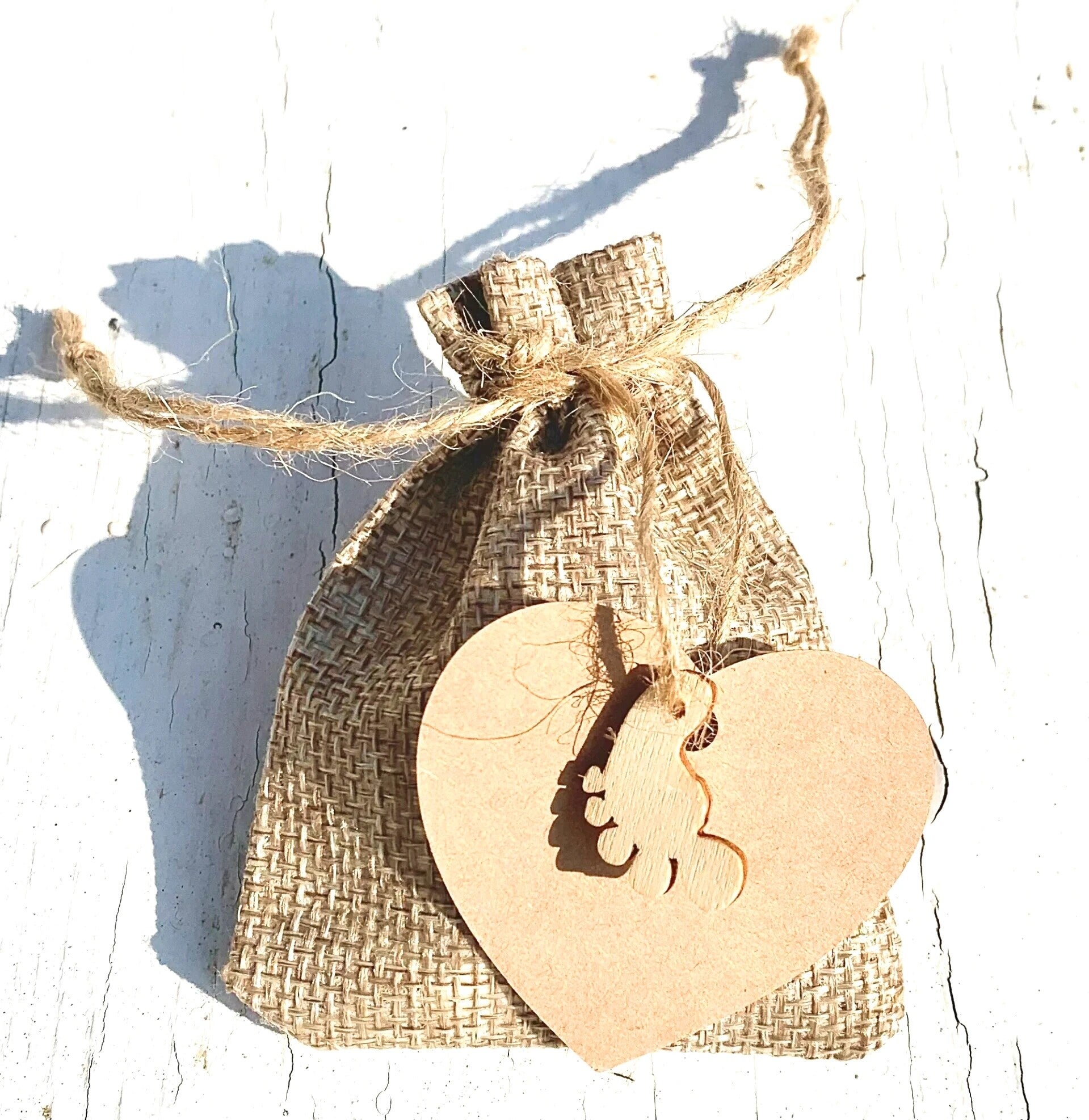 Jute giftbag met 15 hartvormige mini pepermuntjes, houten gelukspoppetje baby voetje en hartvormig kraft kaartje