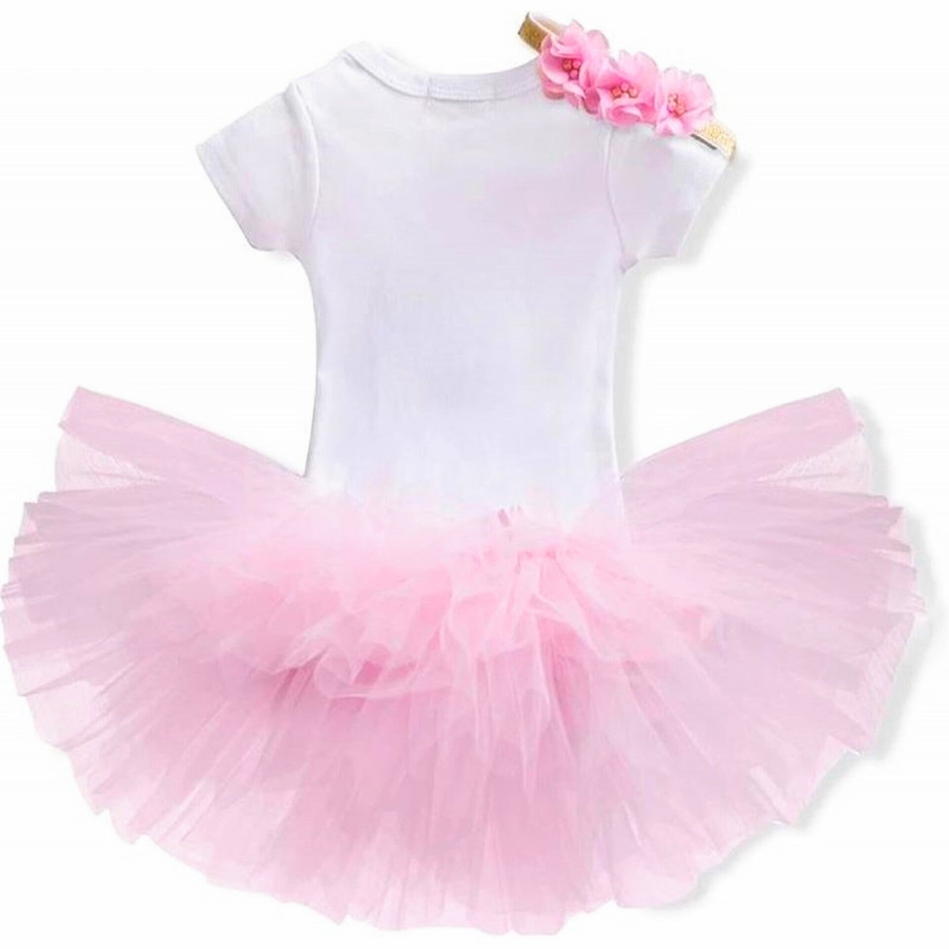 Prachtige, heerlijk draagbare set voor een meisje in de kleuren wit, zilver en licht roze. Het setje bestaat uit een witte romper met in zilver One met zilveren Unicorn en roze bloemen, een weelderige roze tutu en een zilveren haarband met 3 roze bloemen.