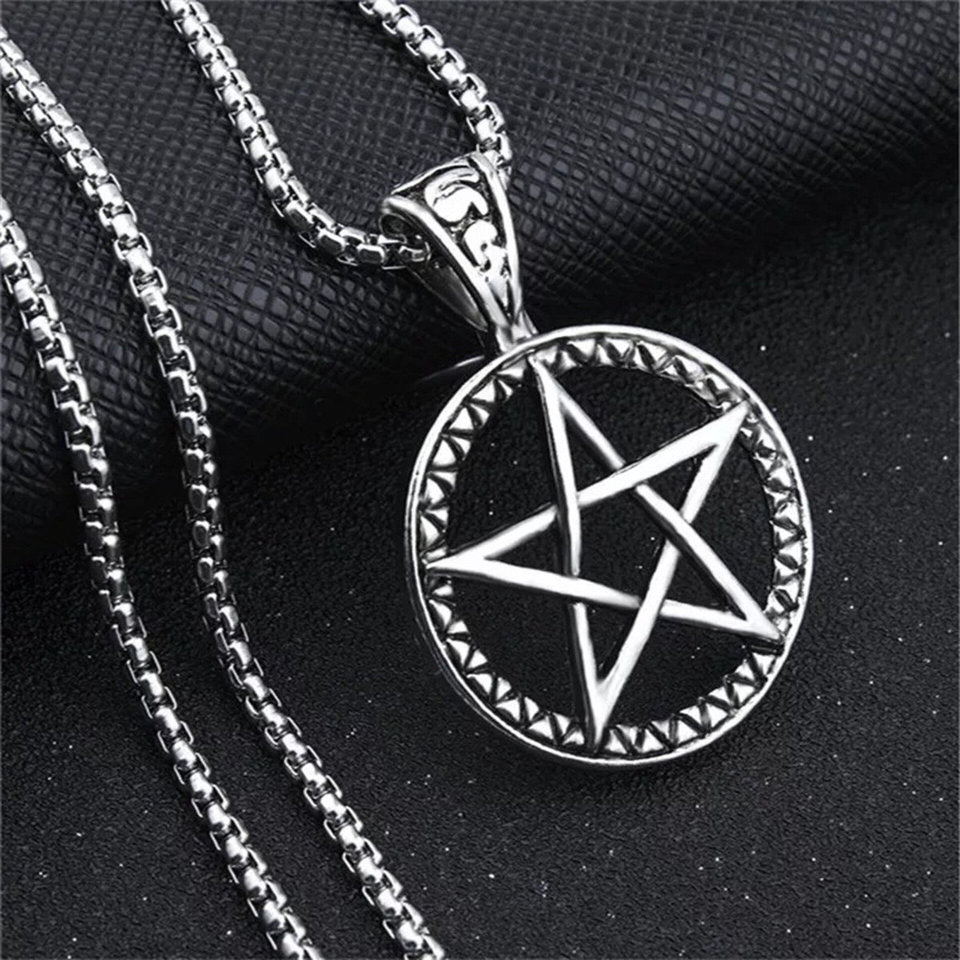 Lange heren ketting Gothic Pentagram rond zilverkleurig
