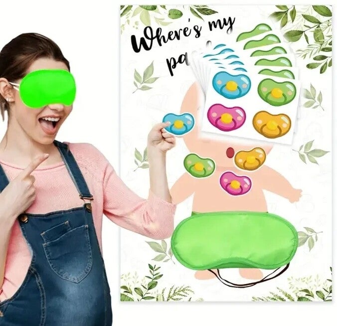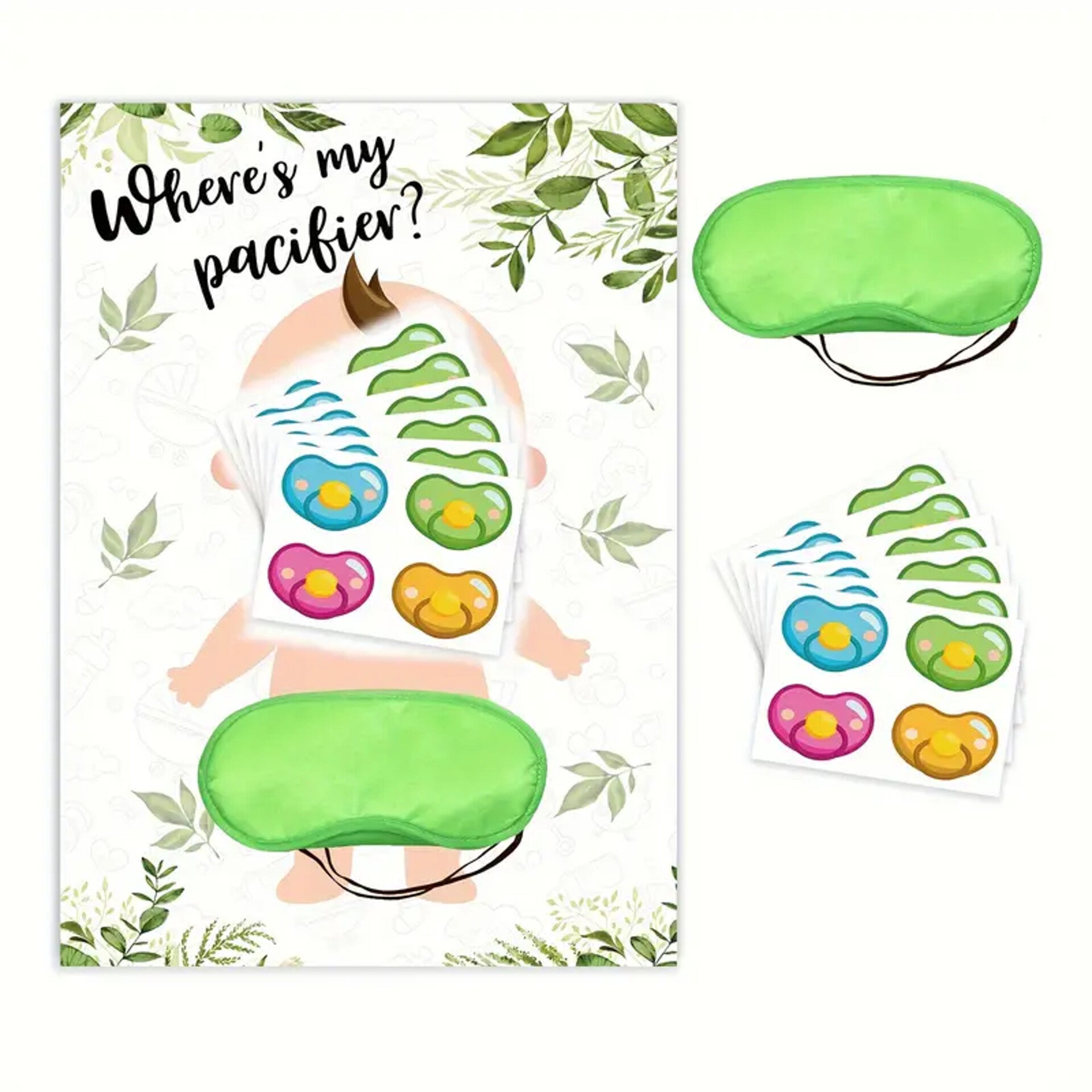 Op elke sticker kan de naam van de speler gezet worden. Afhankelijk van het aantal spelers heeft elke deelnemer 1 of meerdere stickers om het mee te proberen. Draai degene die aan de beurt is 3x rond en laat hem of haar dan met de bijgeleverde 'blinddoek' in de vorm van een kartonnen bril proberen de speen zo dicht mogelijk bij de mond van de baby te plakken.
