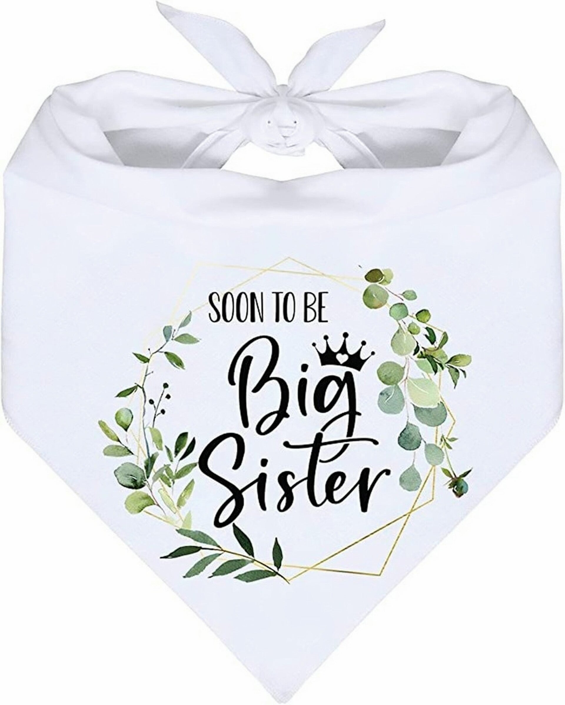 Honden bandana Soon to Be Big Sister wit met zwarte tekst en bladeren
