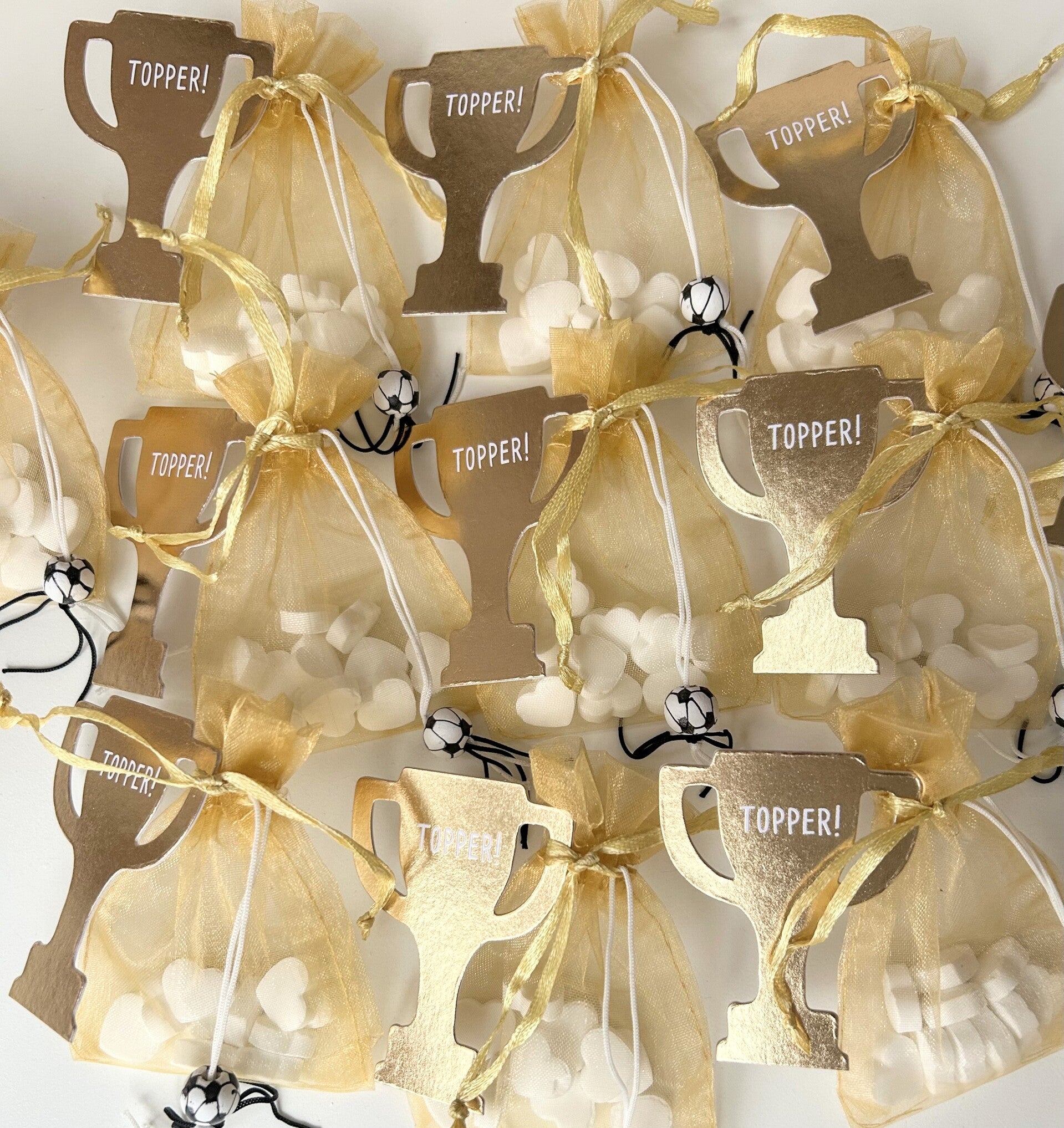 Dit grappige cadeautje bestaat uit een goudkleurig organza zakje met gelukspoppetje voetbal, 10 hartvormige mini pepermuntjes en een kartonnen kaartje in de vorm van een beker met aan de voorkant de tekst topper op een glanzende gouden ondergrond. De achterkant van het kaartje is blanco en beschrijfbaar.