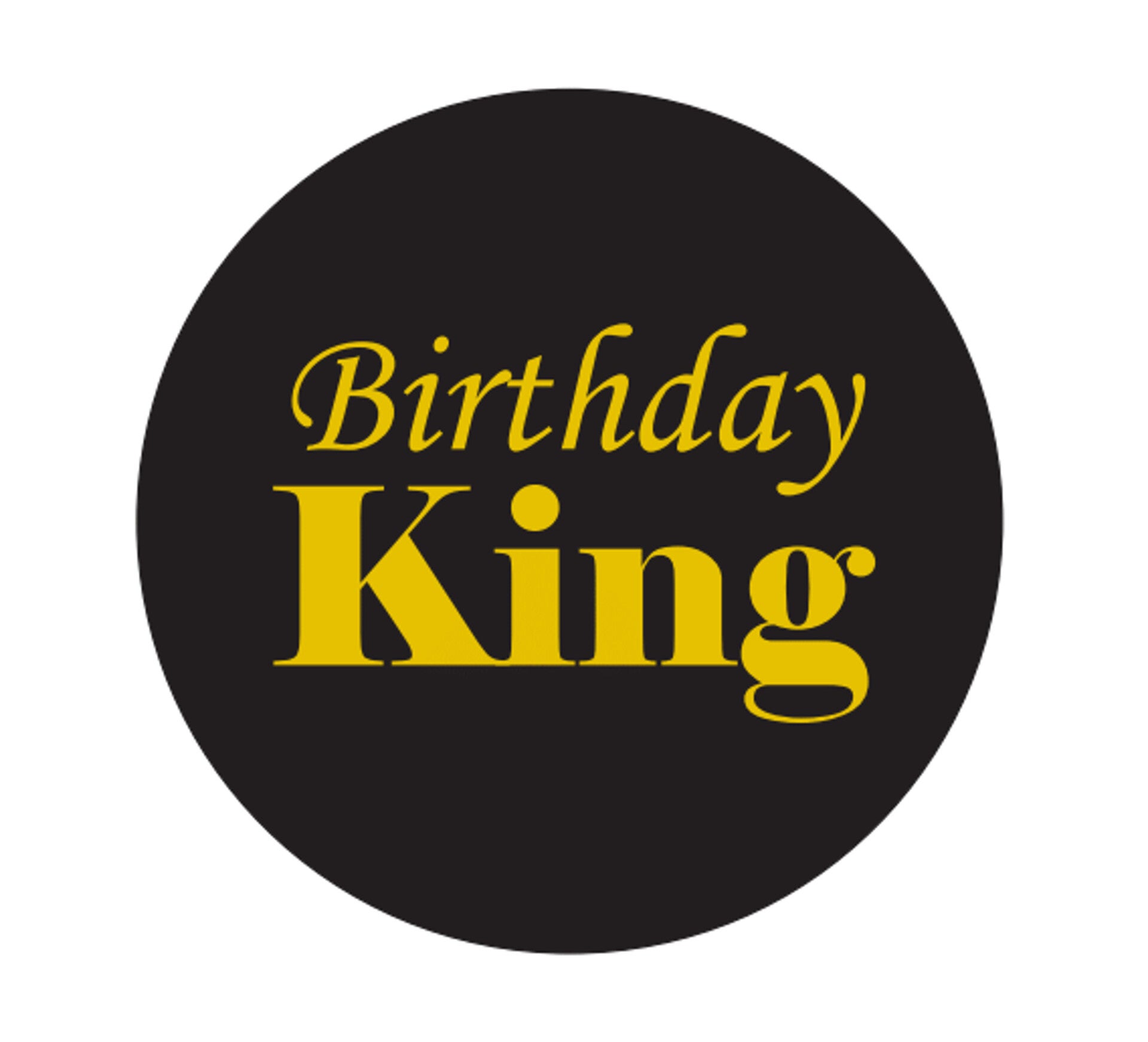 Button of kleding (magneet) Birthday King zwart met of zonder eigen tekst