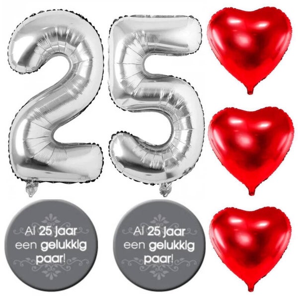 Deze set bestaat uit 3 zilveren harten en de zilveren cijfers 25 en 2 buttons Al 25 Jaar een gelukkig Paar.