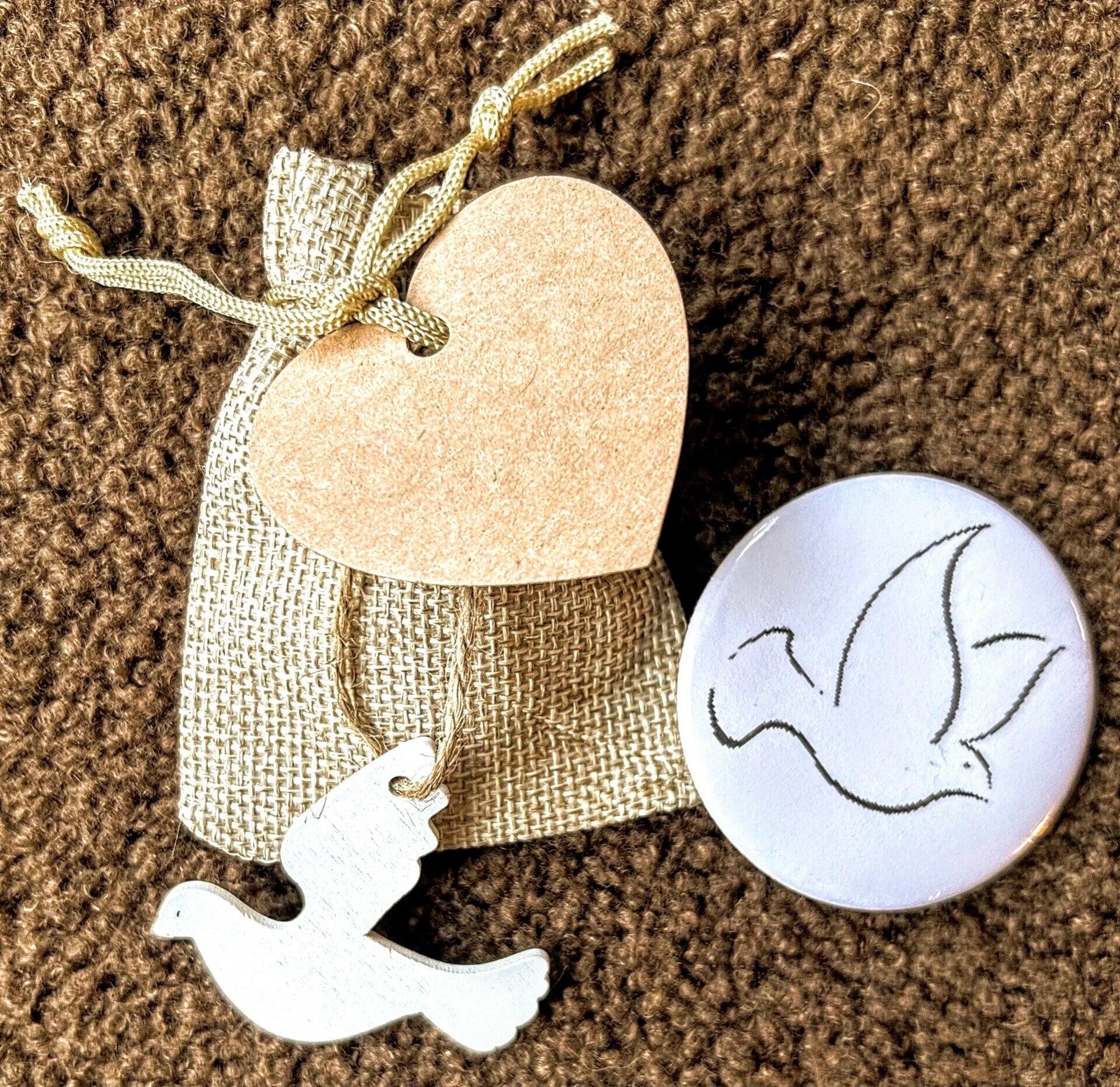 Jute zakje met gelukspoppetje en button Vredesduif en hartvormig kraft kaartje