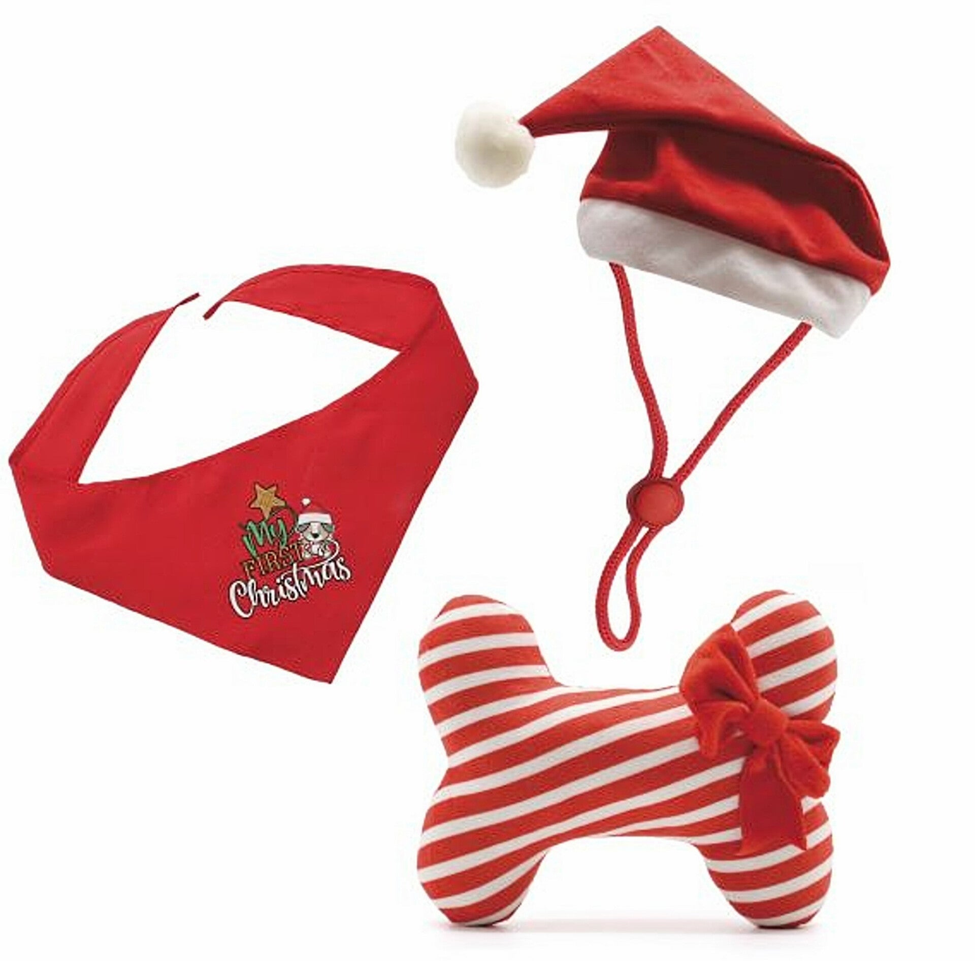 De set bevat een hondenknuffel in de vorm van een bot dat geluid maakt, een schattige bandana en een kerstmuts, allemaal in kerstthema. Met de tekst "My First Christmas" is dit een ideaal cadeau om de feestdagen met je nieuwe viervoeter te vieren.