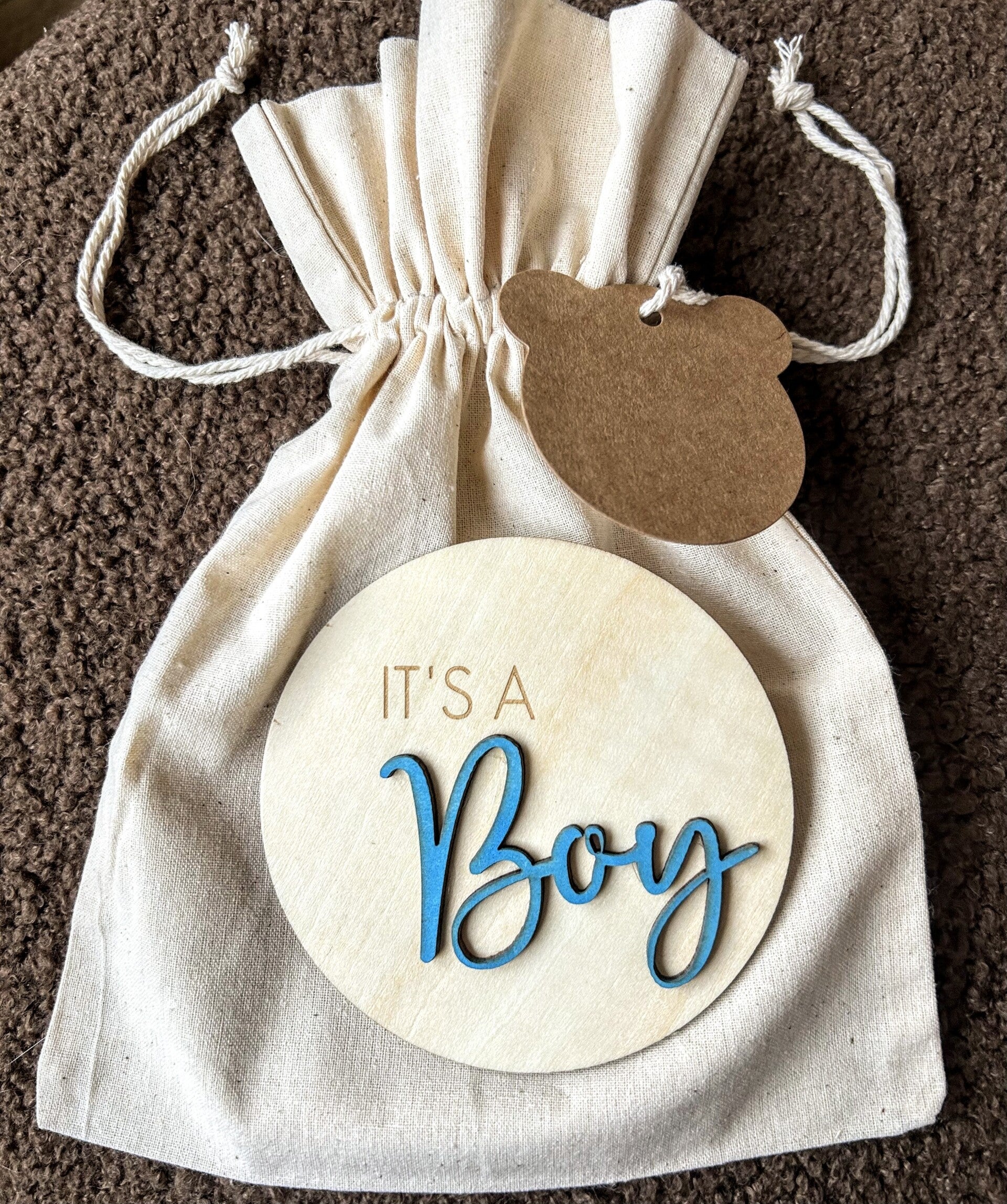 Gender Reveal aankondigingszakje met houten cirkel It's a Boy en berenkaartje