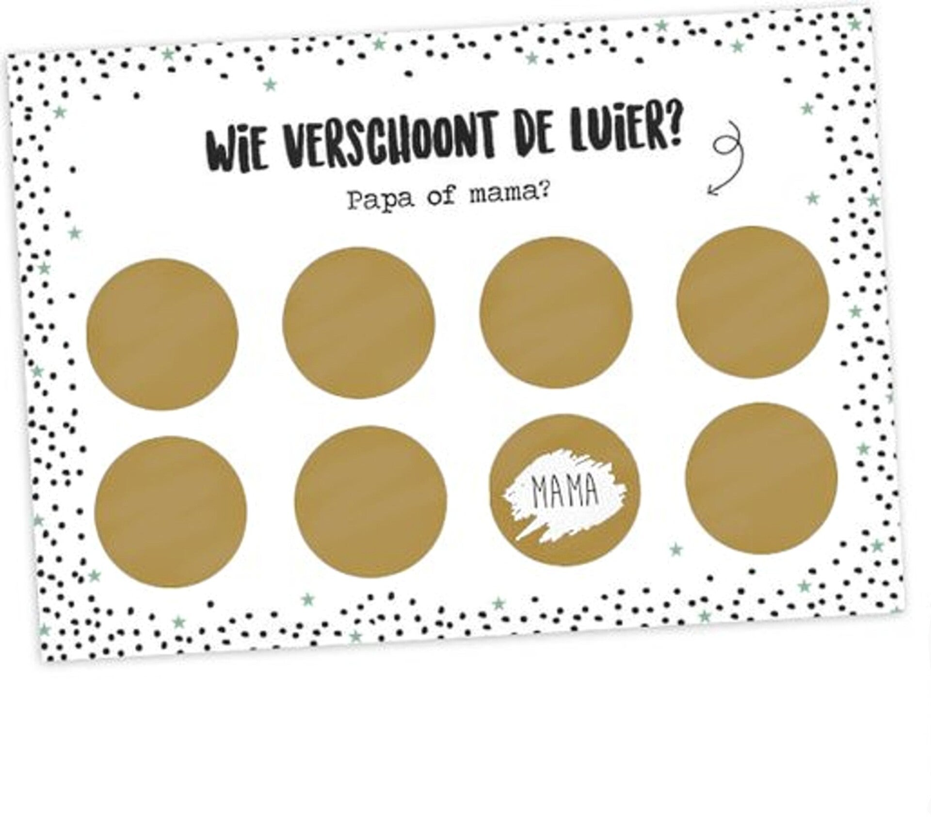 Geen discussies meer over wie de luier moet verschonen, laat deze XL kraskaart het maar beslissen. Onder de goudkleurige kraslagen staan 4x PAPA en 4x MAMA. De kersverse ouders mogen krassen voor geluk dus!