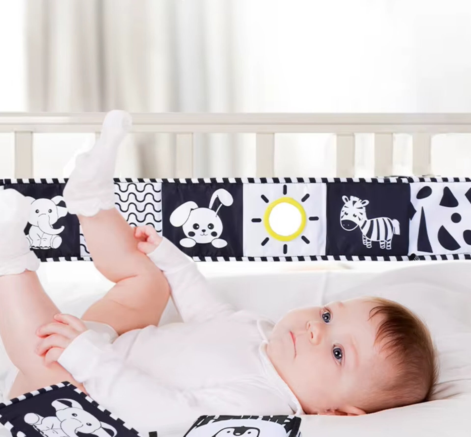 Door het babyboekje uit te vouwen en in de box te hangen, kunnen ook pasgeboren baby’s de afbeeldingen vanaf een korte afstand al heel jong scherp zien. Door de lintjes is het makkelijk te bevestigen aan de spijlen van de box of aan iets anders.