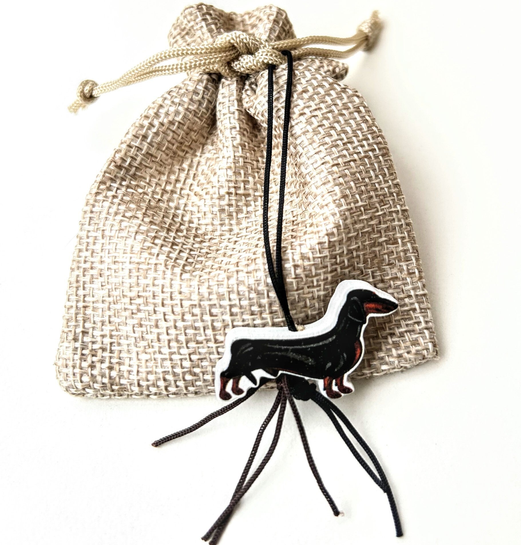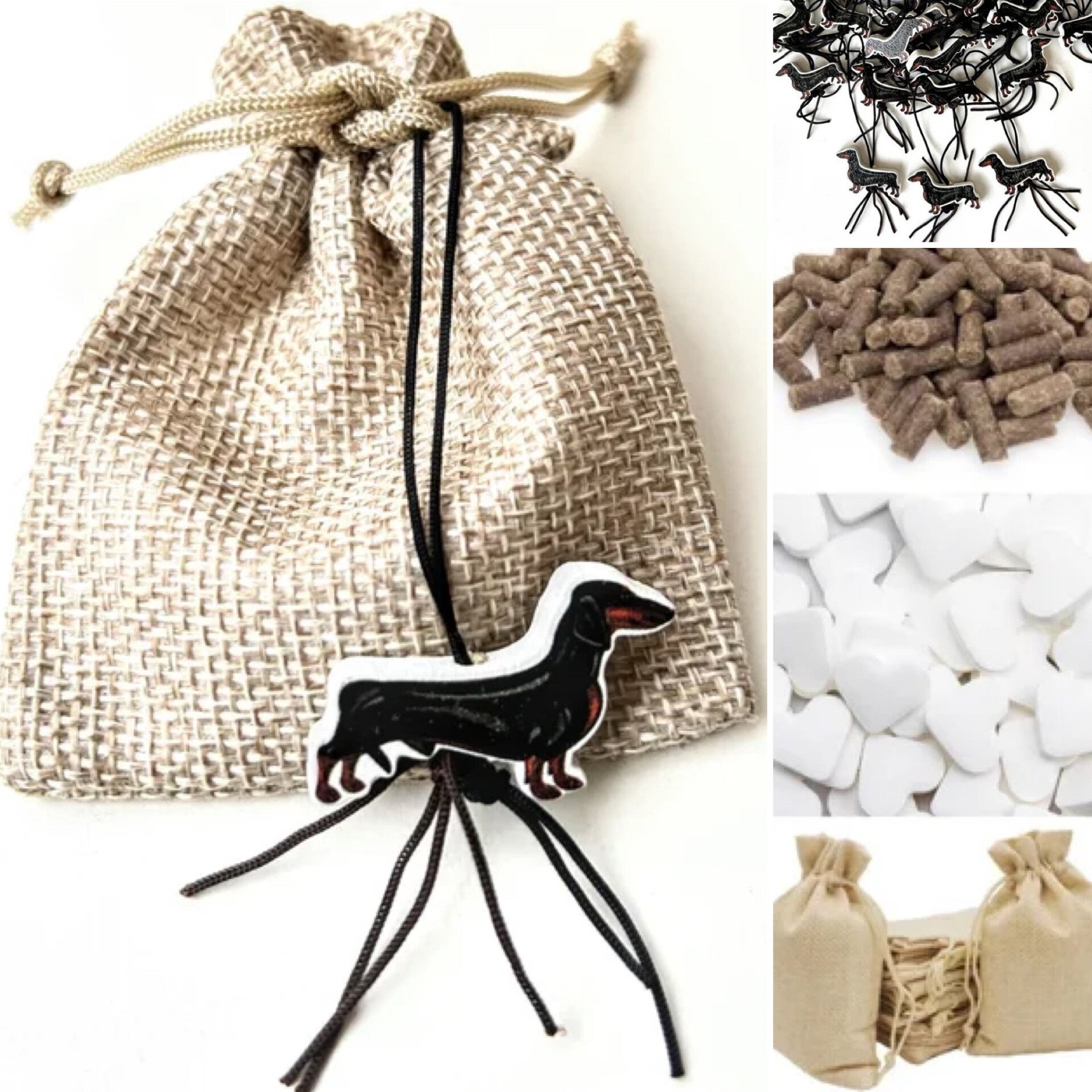 Jute zakje met houten gelukspoppetje Teckel en vulling naar keuze
