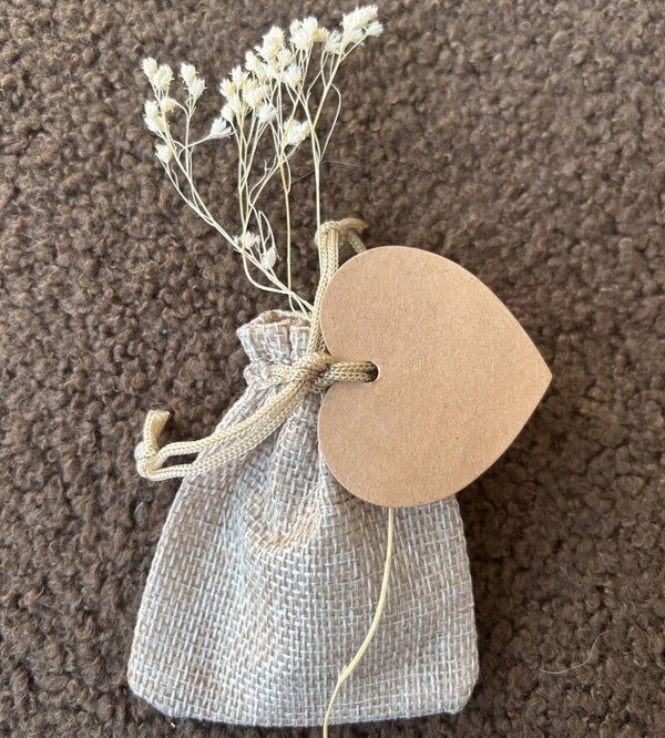 Jute giftbag met hart kraft kaartje, 10 mini hart pepermuntjes en droogbloem
