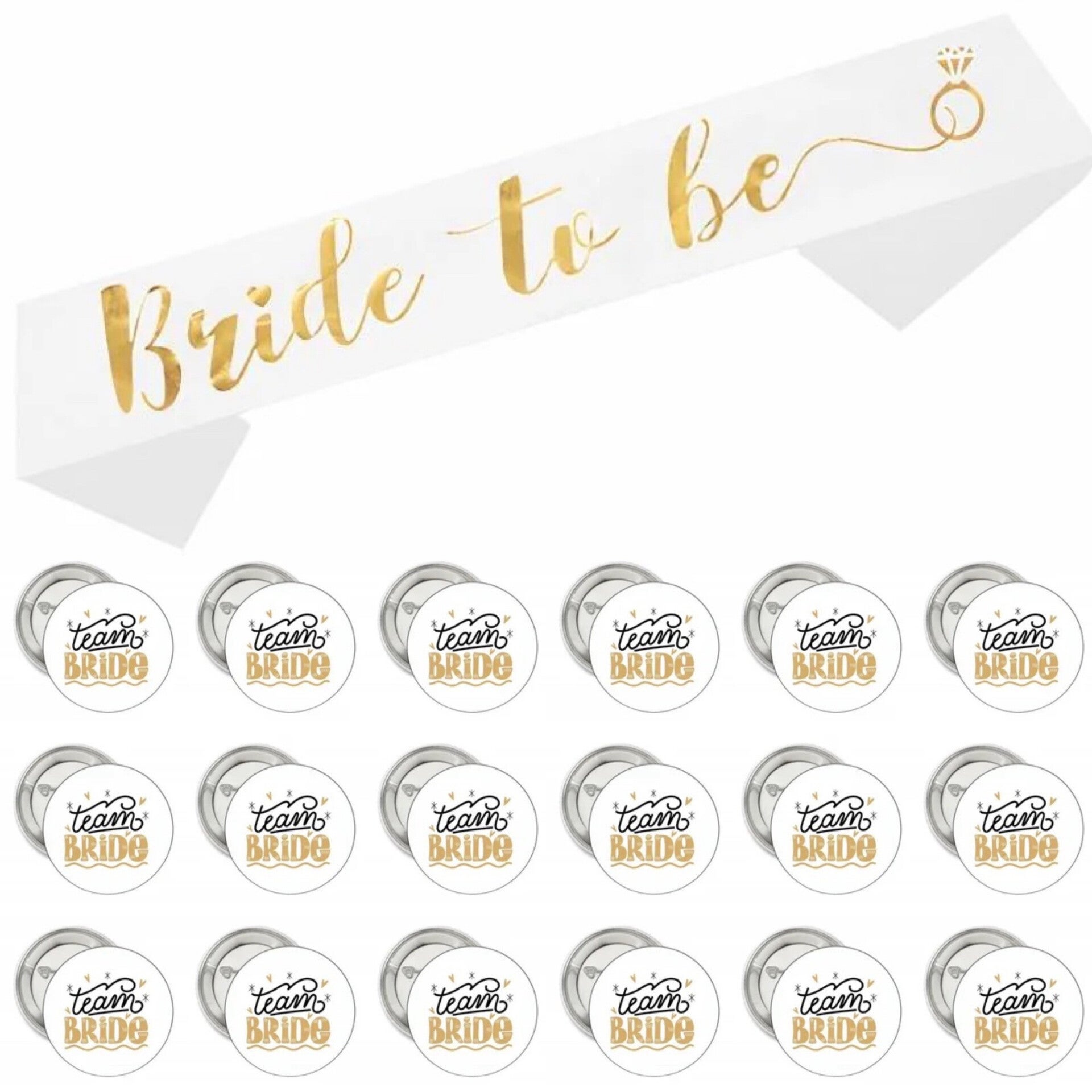 Bride to Be en Team Bride set met 1 sjerp en 18 buttons goud met wit