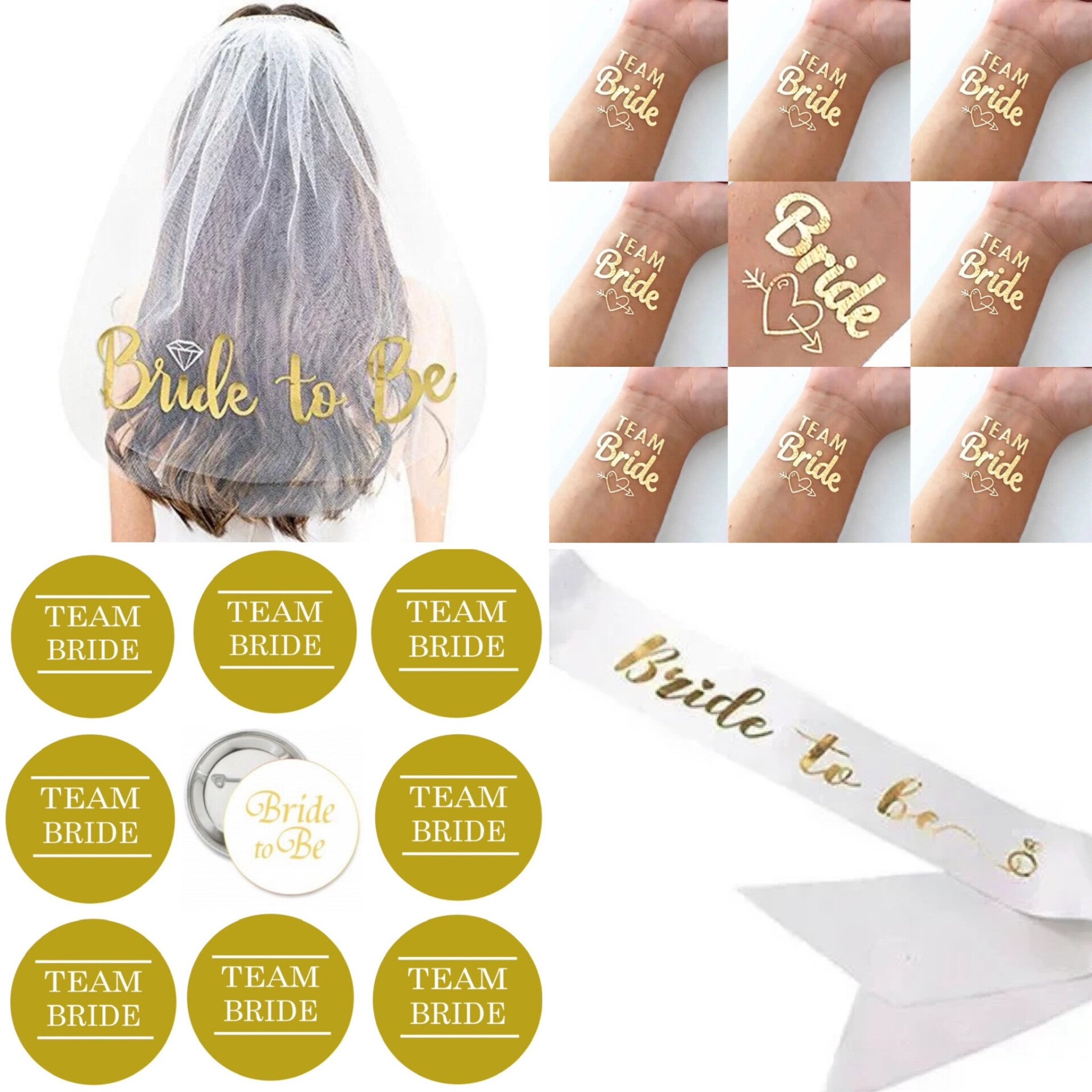 - 9-delige verwijderbare bruidstatoeage set Bride to Be en Team Bride, waarvan 1 Bride en 8 Team Bride. Deze tatoeages zijn ook als glas decoratie te gebruiken. Ze zijn makkelijk aan te brengen én weer te verwijderen