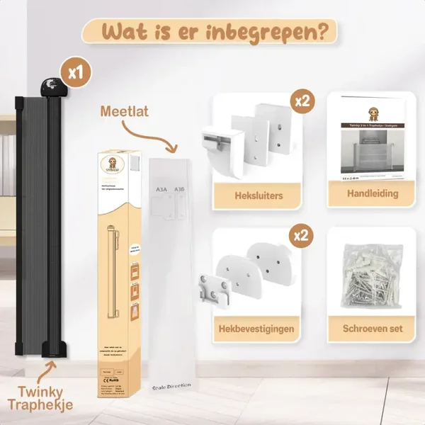 1x Traphekje + 1x Schaalfiguren + 1x Uitroltubes + 2x Schroef + 4x Muurbevestiging + 4x Bevestigingsring + 4x Gripper
