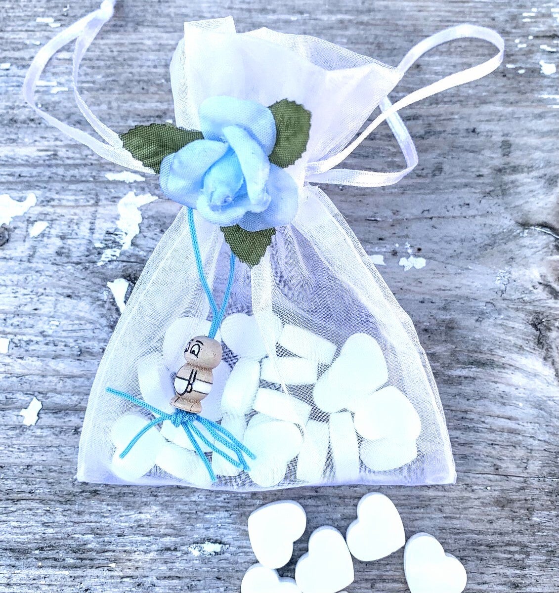 Organza zakje wit met blauw bloemetje, gelukspoppetje en 15 hartvormige mini pepermuntjes