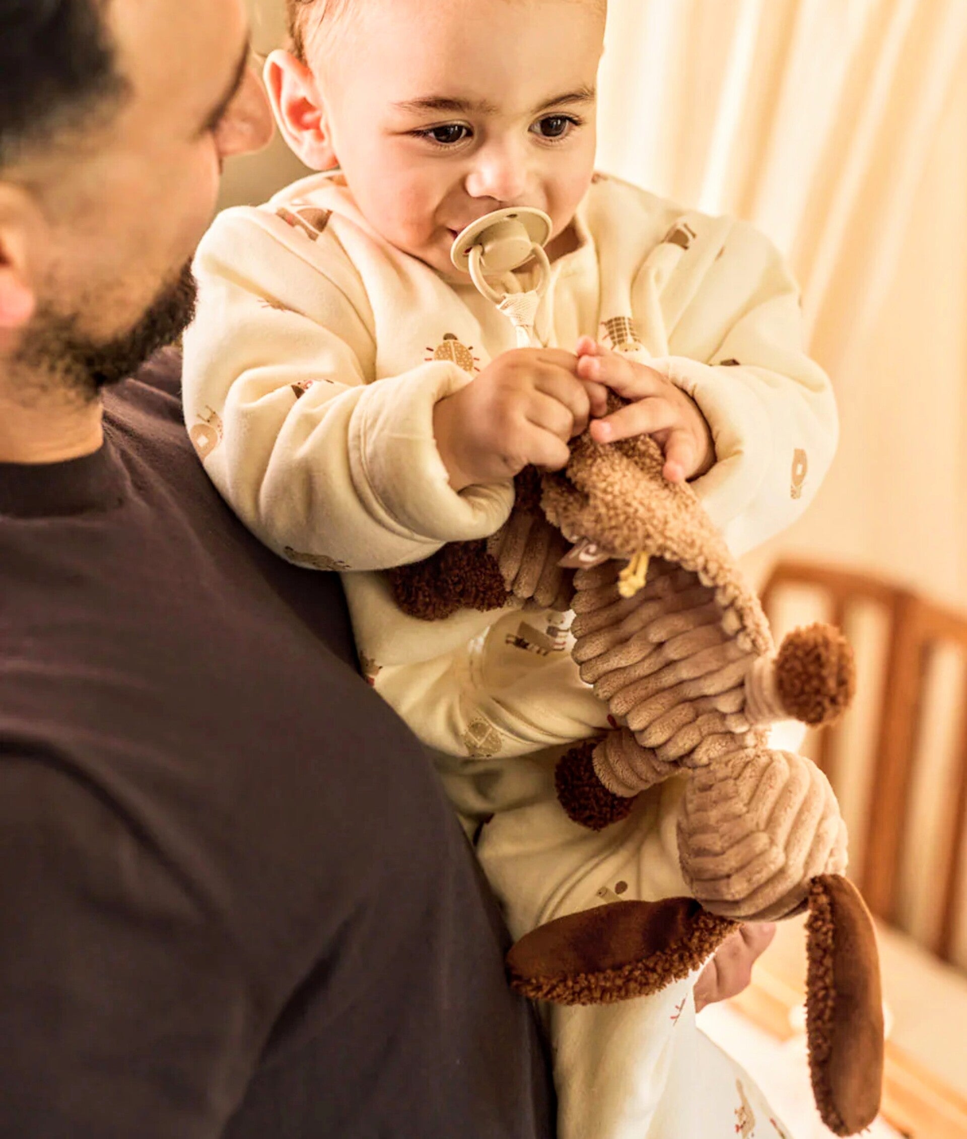 Dit schattige speendoekje van Animal Friends heeft de vorm van een lief hondje genaamd Diego. Het doekje is gemaakt van zachte ribstof in de kleur biscuit, met leather brown bouclé oren, handjes en voetjes. De geborduurde oogjes en het Jollein label geven het doekje een speelse uitstraling en zorgen voor urenlang knuffelplezier. Het koordje maakt het makkelijk om het doekje aan een speen vast te maken, zodat je kleintje deze altijd bij de hand heeft.