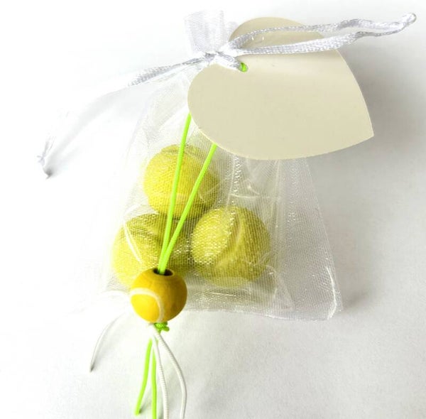 Dit grappige cadeautje bestaat uit een wit organza zakje met gelukspoppetje tennisbal, 3 kauwballetjes in de vorm van een tennisbal en een hartvormig beschrijfbaar kartonnen kaartje, afmeting 52 mm breed x 67 mm hoog