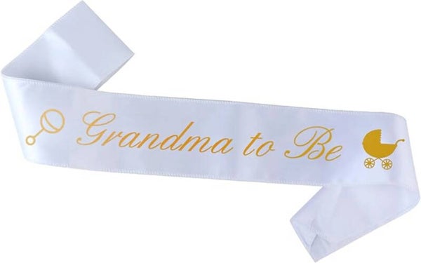 - 1 sjerpen Grandma to Be wit met glanzend gouden opdruk. Breedte per sjerp: 9 cm. Lengte per sjerp: 1,83 meter. De afbeeldingen zijn met ooievaar en babyvoetjes (zie 2e foto)