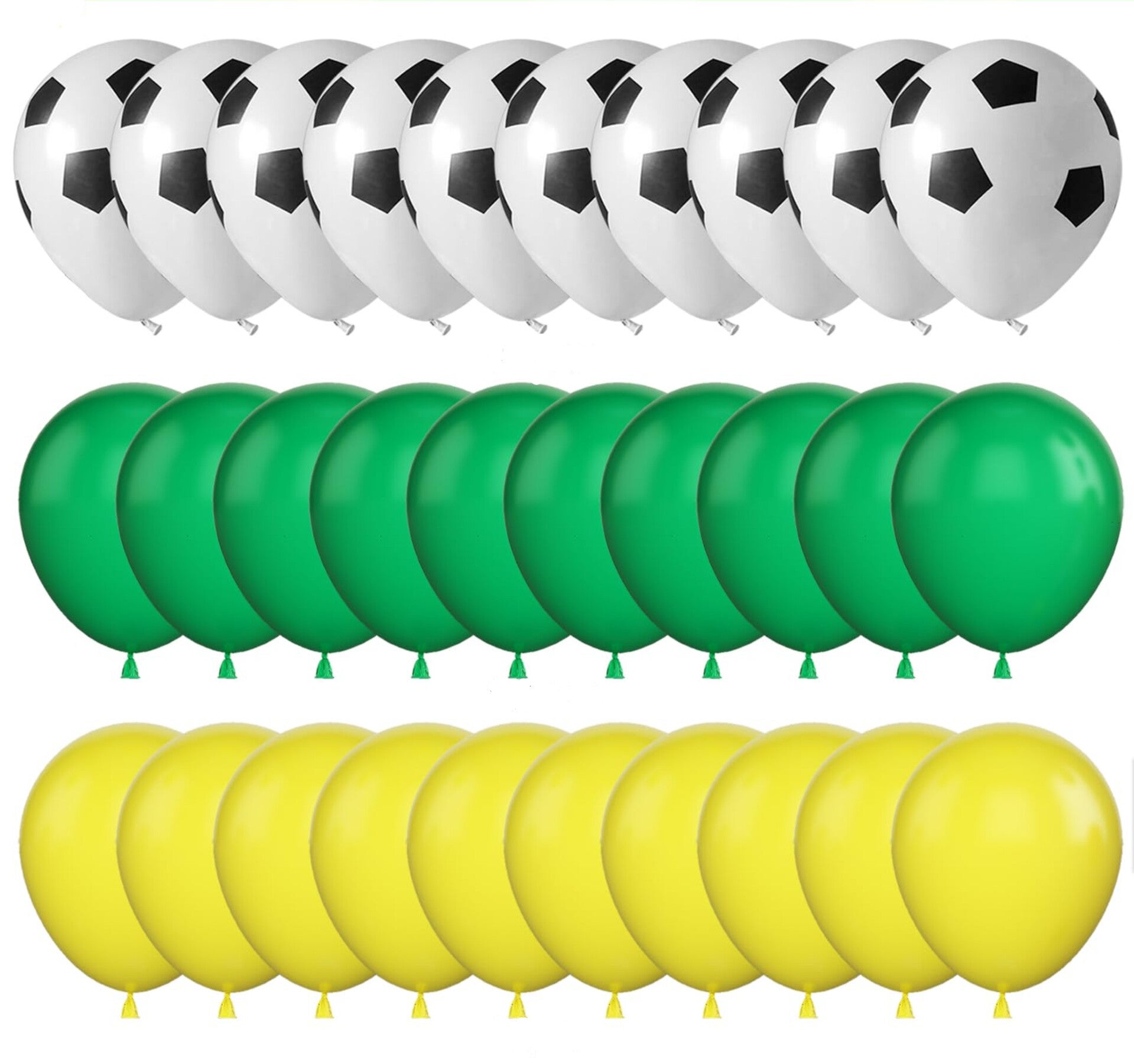 Deze set bestaat uit:- 10 voetbal ballonnen wit met zwart- 10 groene ballonnen- 10 gele ballonnen